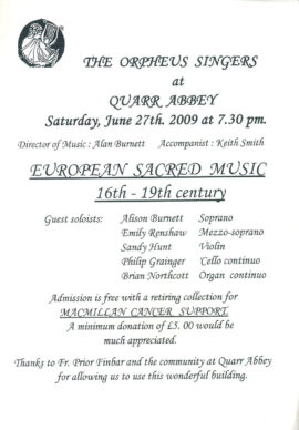 The Orpheus Singers at QUARR ABBEY 2009 Programme European Sacred Music folded paper leaflet refb101002