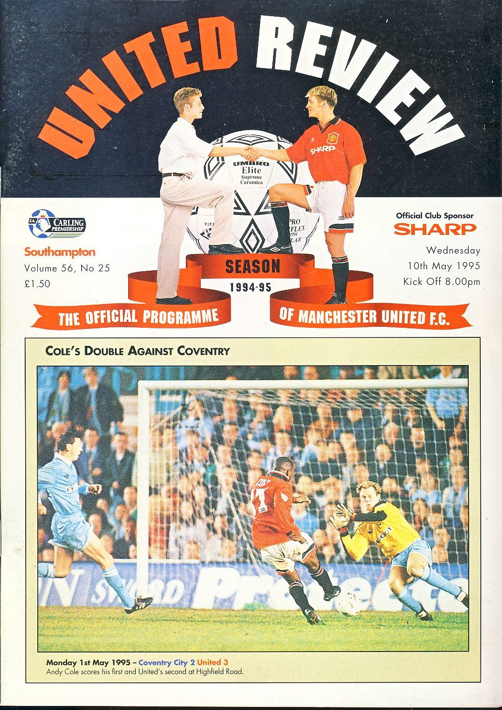 10th May 1995 Manchester Utd vs Southampton Official Programme DAVID BECKHAM & JOHN O’KANE centre photos ref100111