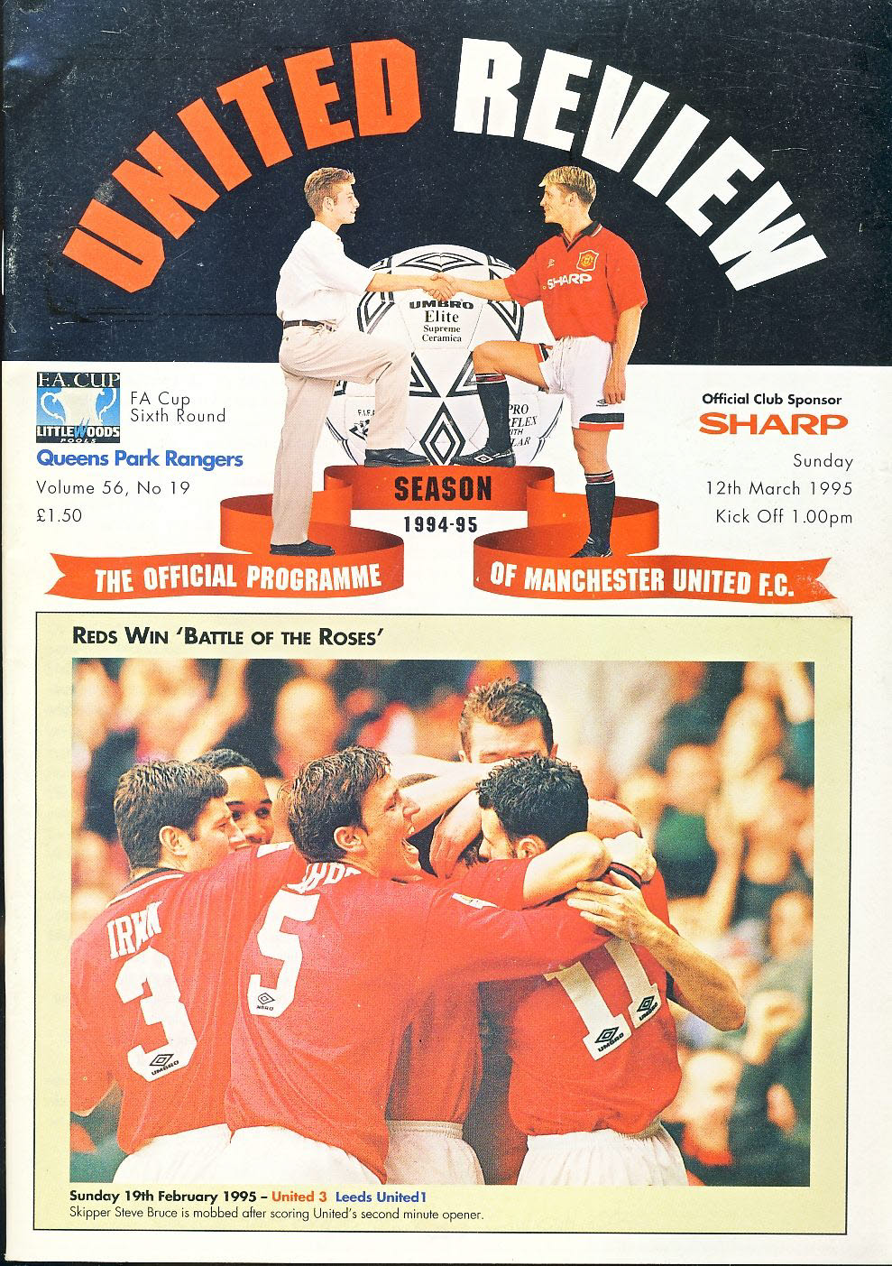 12th March 1995 Manchester Utd vs QPR Official Programme SIMON DAVIES centre fold photo ref100116 Vintage publication as listed and shown in the photo. Please read full description for condition report.