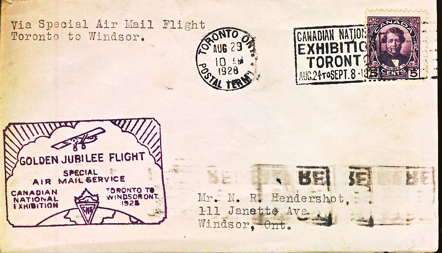 1928 Special Air Mail Golden Jubilee Flight Cover Canada Toronto to Windsor – addressed to Mr. N.R. Hendershop, 111 Janette Avenue. refA394