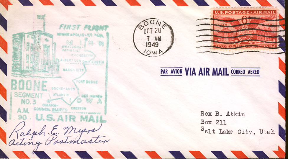 1949 First Flight US Air Mail Cover Boone Iowa to Rex B. Atkin Salt Lake City SIGNED Ralph E Myera acting Postmaster – sealed refA383