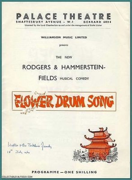 1960 Palace Theatre FLOWER DRUM SONG Rodgers & Hammerstein 2nd – with Yau Shan Tung YAMA SAKI Tim Herbert KEVIN SCOTT George Pastell IDA SHEPLEY – has a photo inside of Princess Margaret meeting the cast after attending the Premiere with Jerome Whyte American director