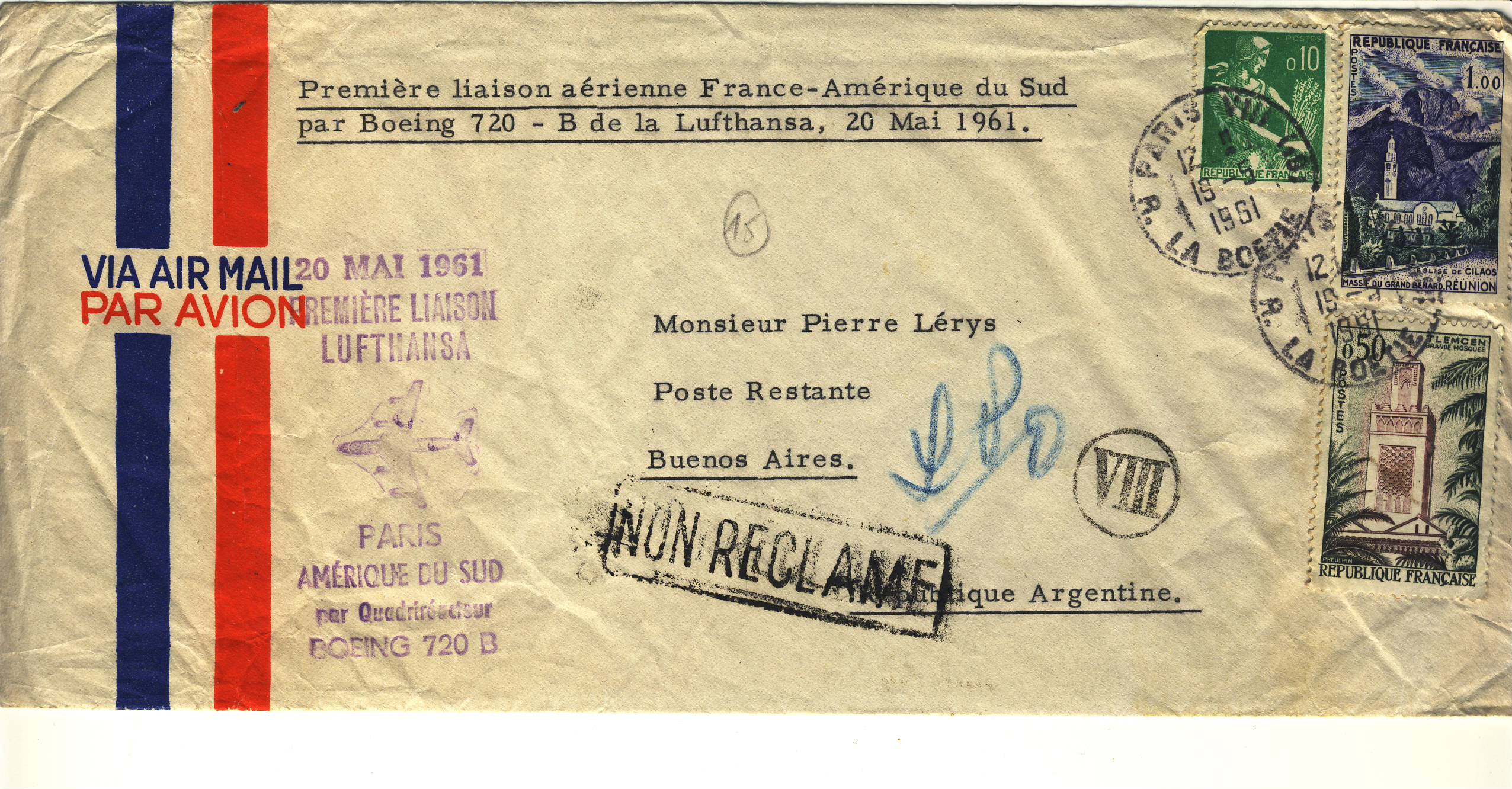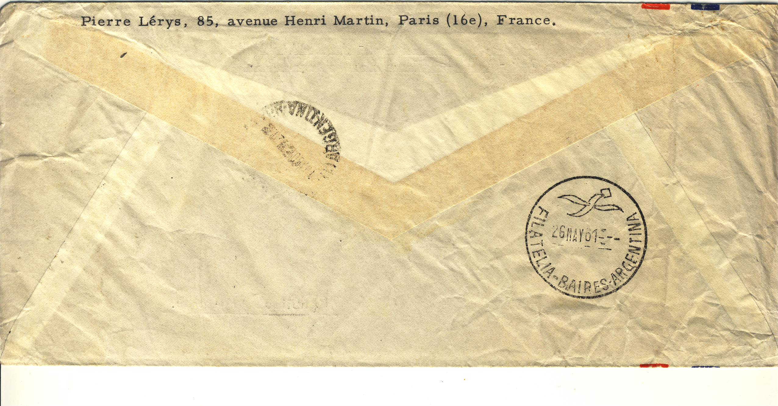 Addressed to Monsieur Pierre Lerys, Buenos Aires ARGENTINA and avenue Henri Martin PARIS (16e). Has creases and marks. Condition is appropriate for age and having travelled around the world with several postal delivery points, handling and several stops in 1961. Sealed.