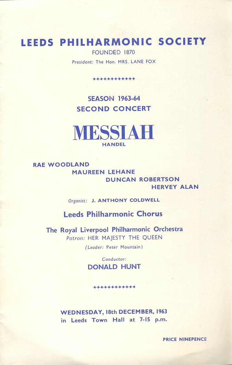 1963 LEEDS Philharmonic MESSIAH Handel vintage programme DONALD HUNT ref101603