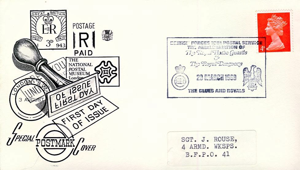 1969 Amalgamation of Blue & Royals Horse Guards & Dragoons Special Postmark FDI BFPO stamp cover refD340
