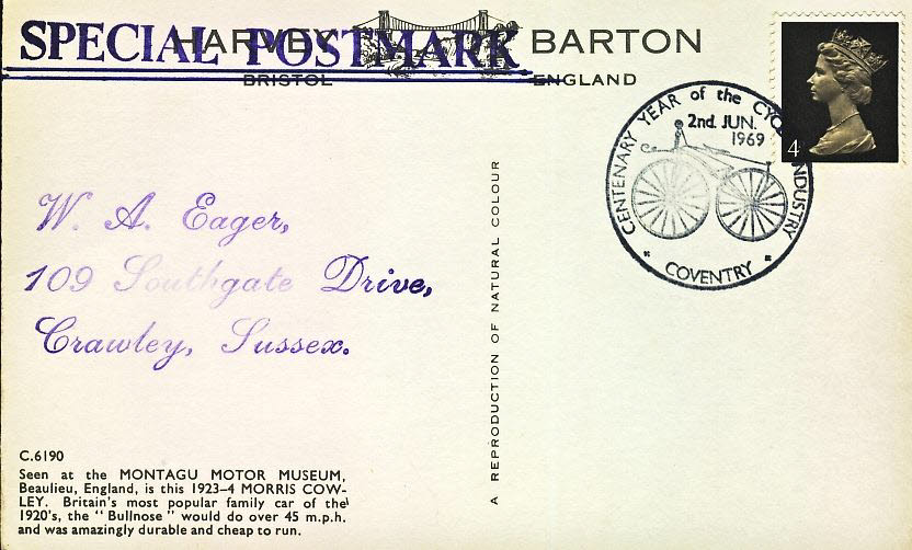 1969 Coventry Cycle Industry Special Postmark Morris Cowley postcard refP6-2