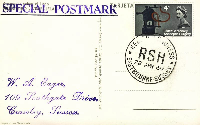 1969 Health Congress RSH Eastbourne Special Postmark Amanecer sobre el Lago Maracaibo Venezuela postcard refP6-19