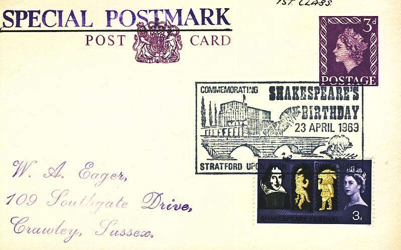 1969 Shakespeare’s Birthday Stratford upon Avon Special Postmark postcard refP6-24