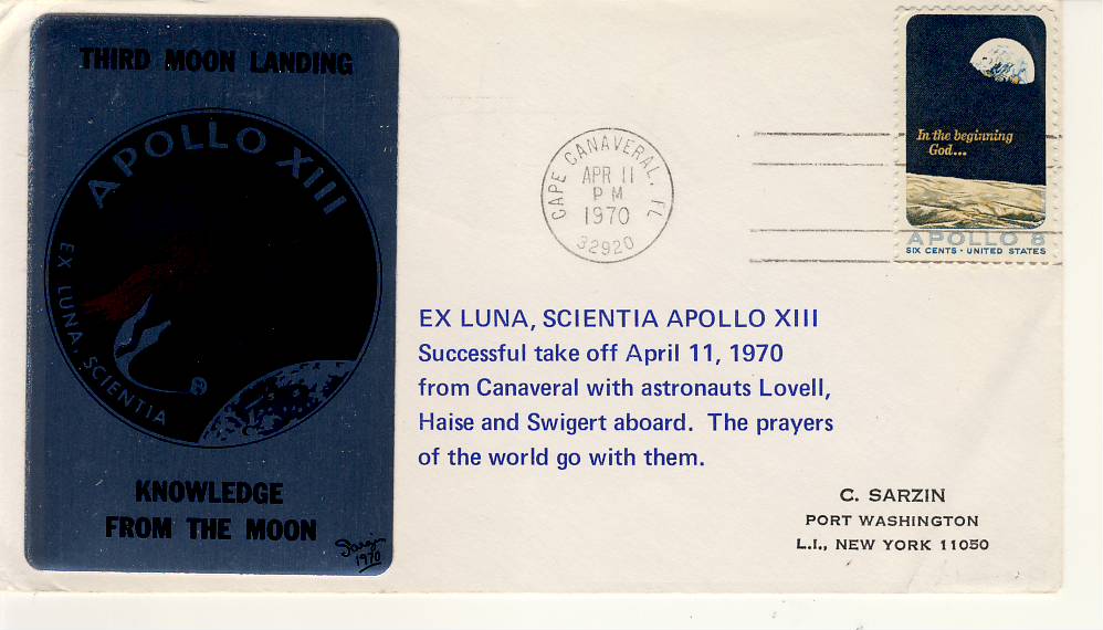 This cover has a shiney metal looking plate on the front. Sorry it won’t scan due to reflection. Ex Luna Scientia Apollo XIII Successful Take off on April 11 1970 from Canaveral with astronauts Lovell, Haise and Swigert aboard. The Prayes of the world go with them. Good Condition for age. Please read full description and see photo.