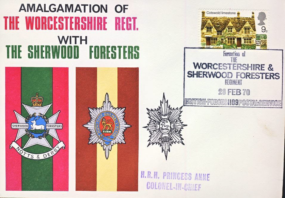 1970 Worcestershire Regt. & Sherwood Foresters HRH Princess Anne Colonel-in-Chief stamp cover refD331 In good condition with handling mark on front and back. Please see larger photo and full description for details.