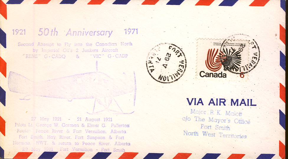 1971 50th Anniversary Canada Airmail Fort Vermillion postmark addressed to Major R K Malott, The Mayor’s Office, Fort Smith, North West Territories. Unsealed. refA389