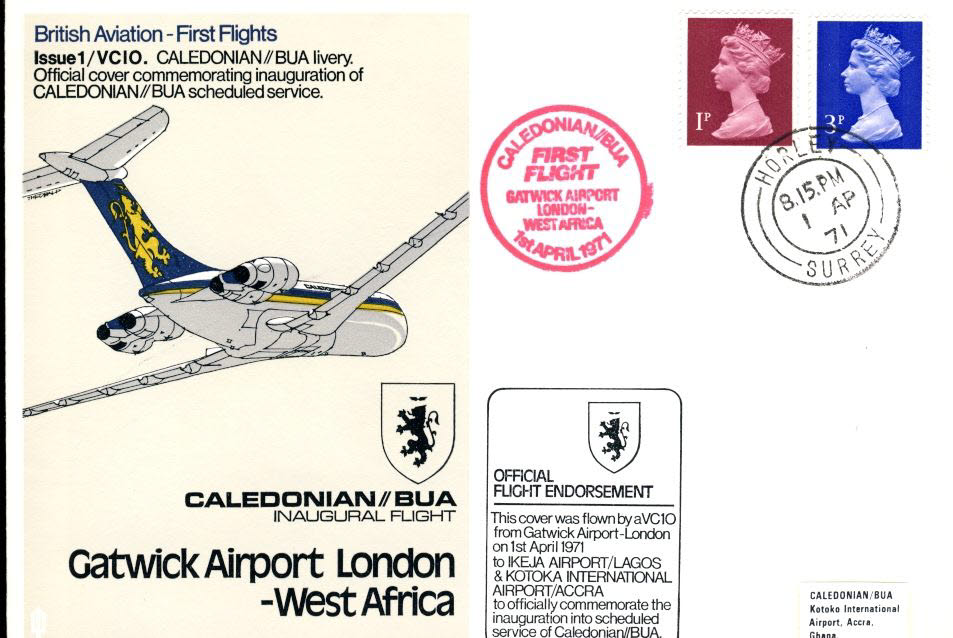 1971 VC10 Caledonian BUA Livery Gatwick-West Africa flown official cover Postmark Horley Surrey refE154