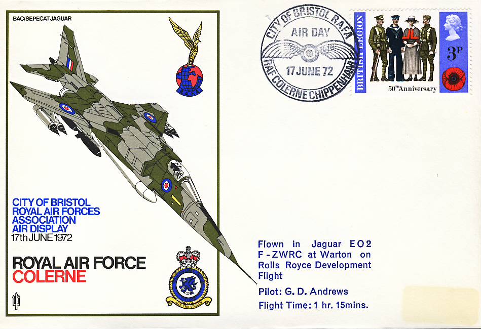 1972 City of Bristol RAF Colerne Warton F-ZWRC flown stamp cover Rolls Royce Development Flight refF121