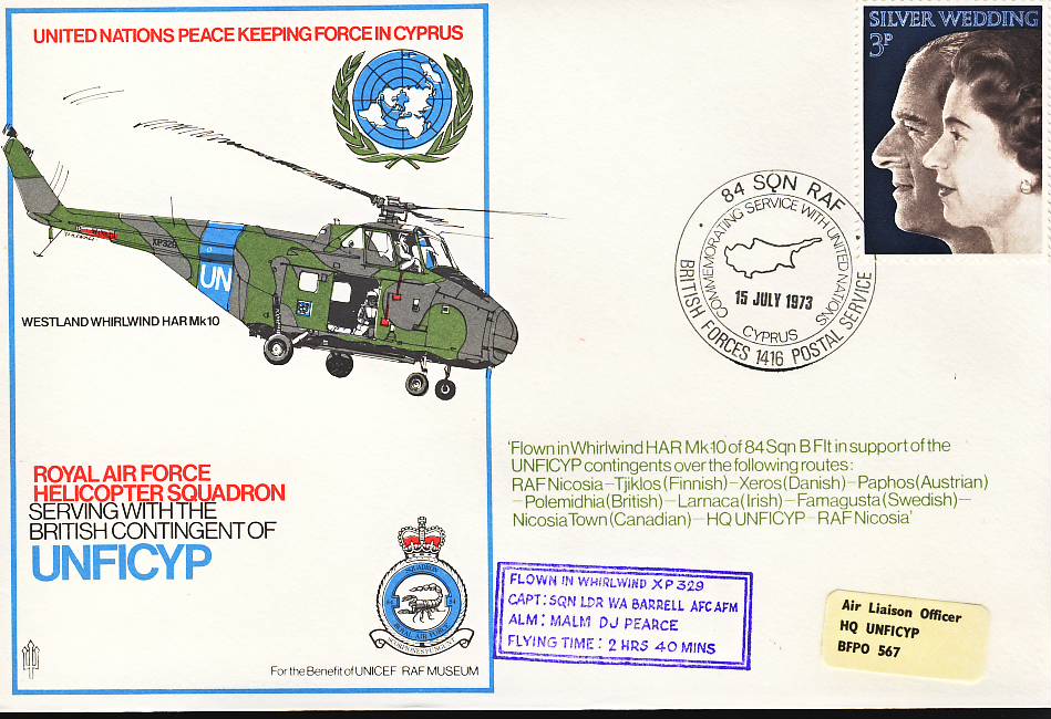 1973 84 SQN RAF flown stamp cover CYPRUS UN Peace Keeping BFPO 1416 refF141 Unsealed no insert.