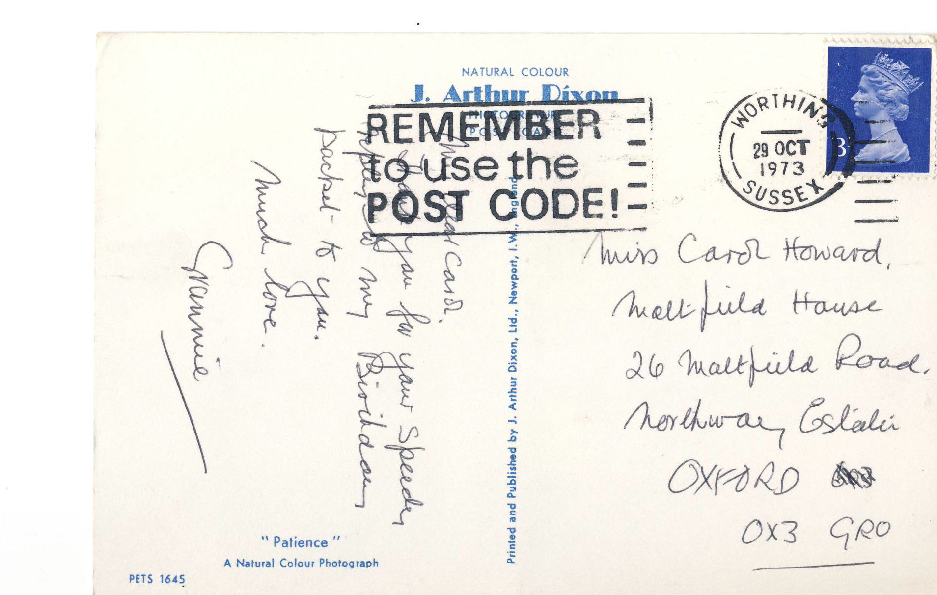 1973 vintage postcard Dog postmarked Worthing Remember Postcode