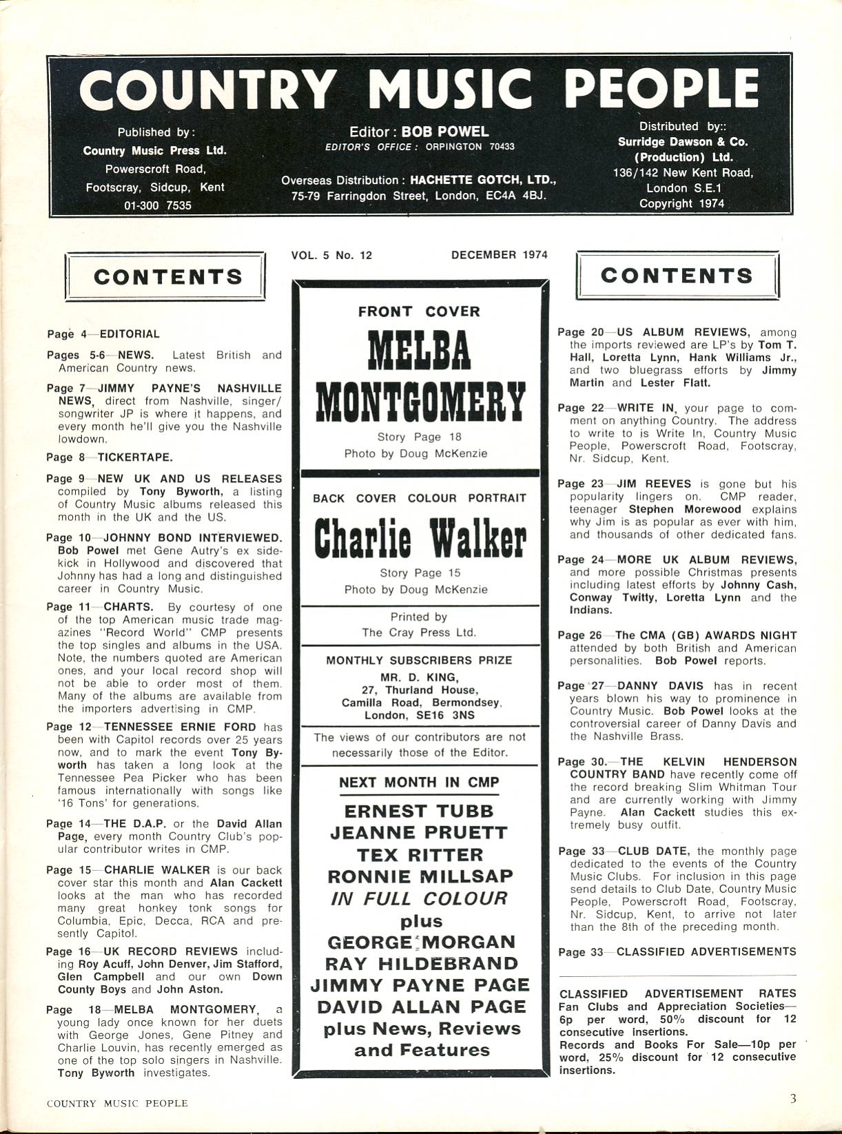 CHARLIE WALKER Good Condition for age. Full of interesting articles, photos and information about the country music scene from about 40 or more years ago. Please read full description and see 2nd photo showing contents list.More infoGood clean condition. This is an original vintage item in read condition. So it may have some page turns creasing, wear and scuffs to covers and spine. This listing is for the MAGAZINE ONLY. Sorry NO freebies, posters, extras or supplements.Please see photos for magazine details. Feel free to ask any questions. We have MANY MORE in our SHOP – please bookmark us and add us to your favourites. Thank you.Reference1974 December Country Music People magazine MELBA MONTGOMERY ref102298