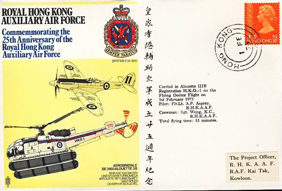 1975 Hong Kong Auxiliary Air Force Flying Doctor Flight Kai Tak Kowloon flown stamp cover refF181 Unsealed with insert.