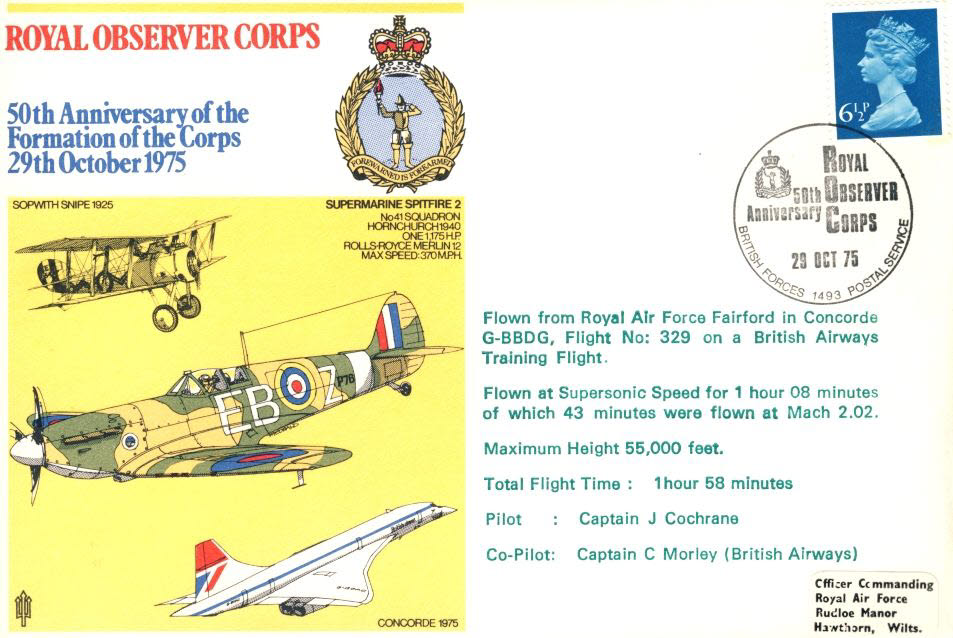 1975 Royal Observer Corps 50th Anniv RAF CONCORDE flown stamp cover refE111