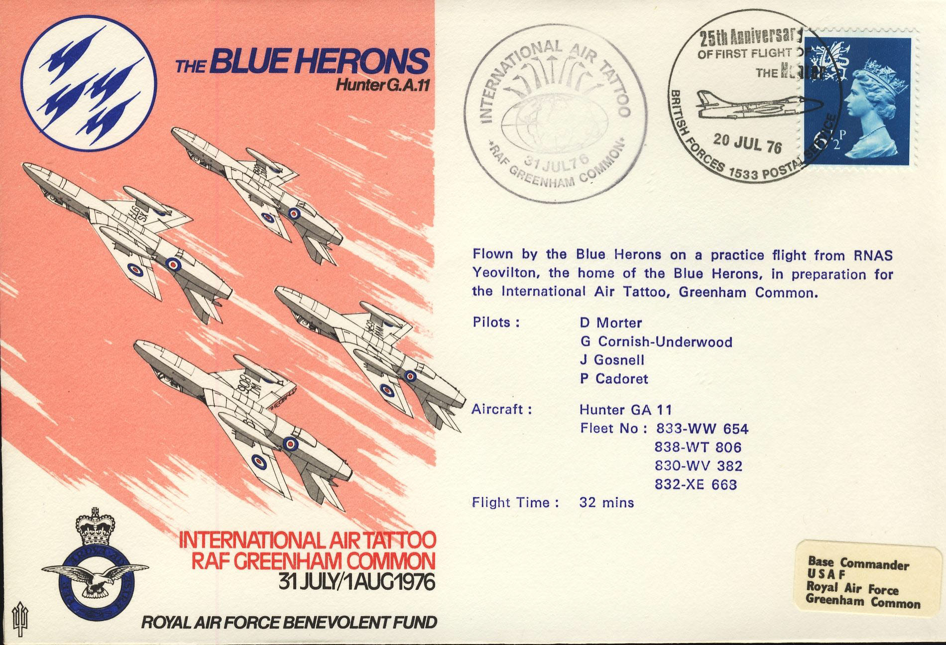 1976 RAF GREENHAM COMMON flown cover BFPO Blue Herons Hunter GA11 rcd33 Very Good condition with insert card. Please see larger photo for details.