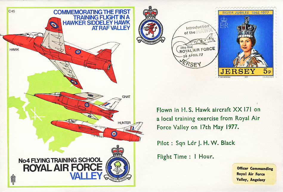 1977 Jersey RAF VALLEY H.S. HAWK flown stamp cover No.4 Flying Training School refF151 Unsealed with insert.