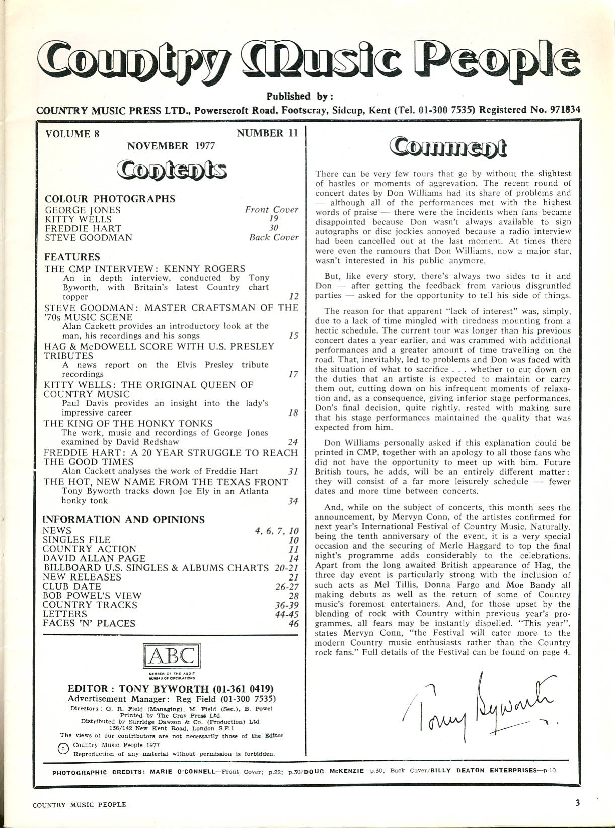 1977 November Country Music People magazine GEORGE JONES, STEVE GOODMAN ref102296