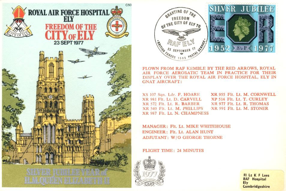 1977 RED ARROWNS Silver Jubilee RAF Hospital ELY flown stamp cover refE77