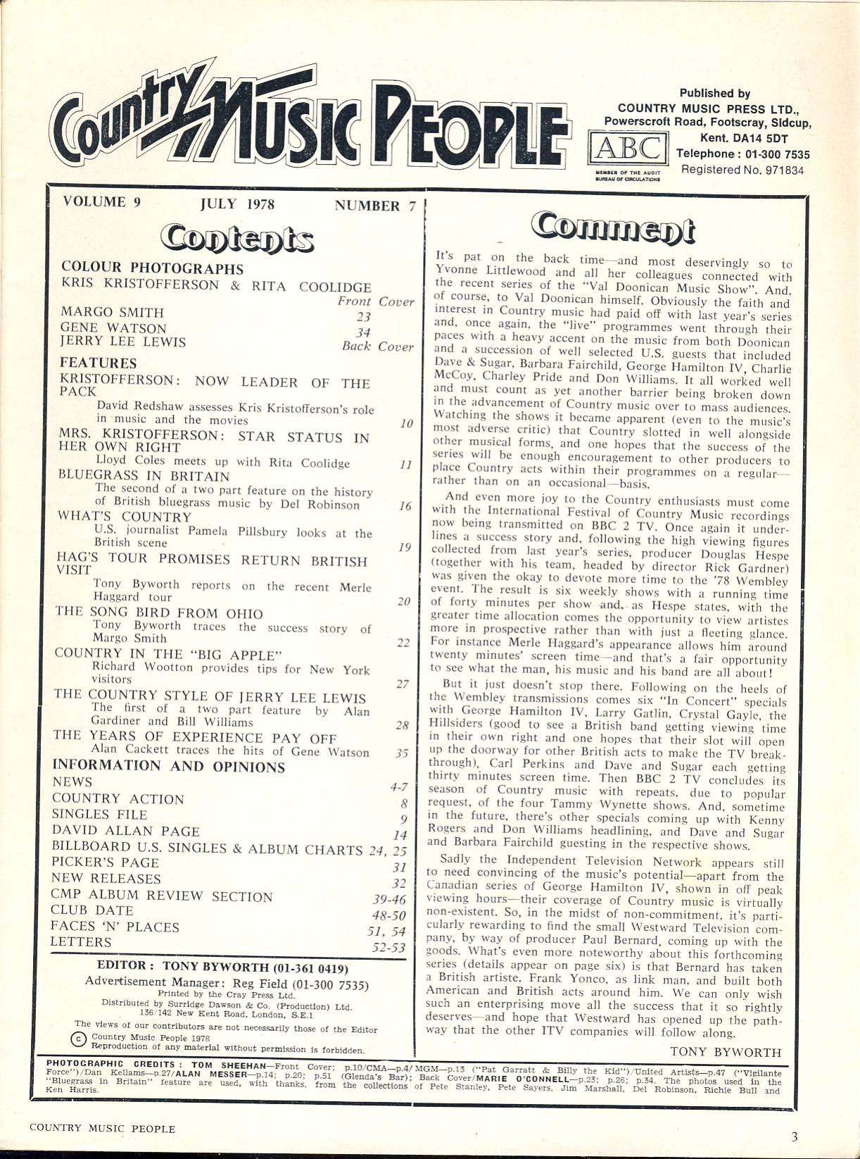 MARGO SMITH, GENE WATSON, JERRY LEE LEWIS. Good Condition for age. Full of interesting articles, photos and information about the country music scene. Please read full description and see 2nd photo showing contents list.