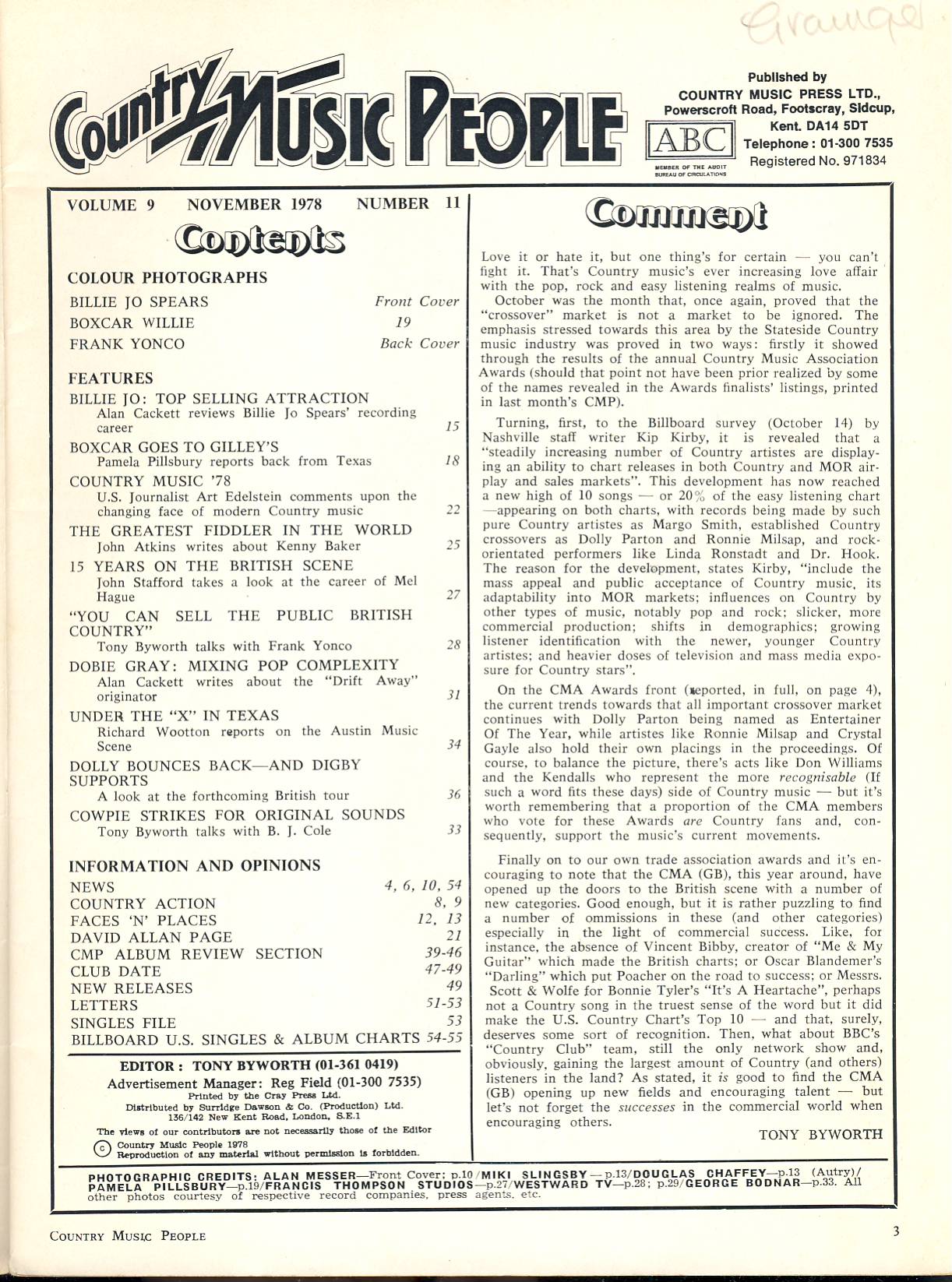 BOXCAR WILLIE, FRANK YONCO. Good Condition for age. Full of interesting articles, photos and information about the country music scene. Please read full description and see 2nd photo showing contents list.More infoGood clean condition. This is an original vintage item in read condition. So it may have some page turns creasing and scuffs to covers and spine. This listing is for the MAGAZINE ONLY. Sorry NO freebies, posters, extras or supplements.Please see photos for magazine details. Feel free to ask any questions. We have MANY MORE in our SHOP – please bookmark us and add us to your favourites. Thank you.Reference1978 November Country Music People magazine BILLIE JO SPEARS ref102269