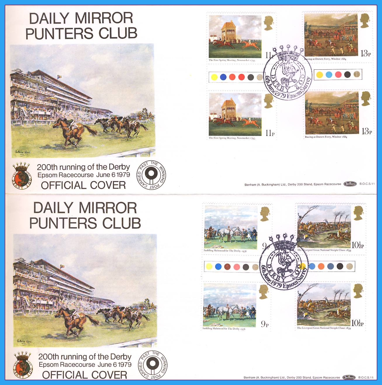 2 x 1979-06-06 Daily Mirror Punter Club EPSOM RACECOURSE OFFICIAL COVER DERBY Horse Racing Paintings traffic light gutter pair Stamps Benham First Day Covers refc137