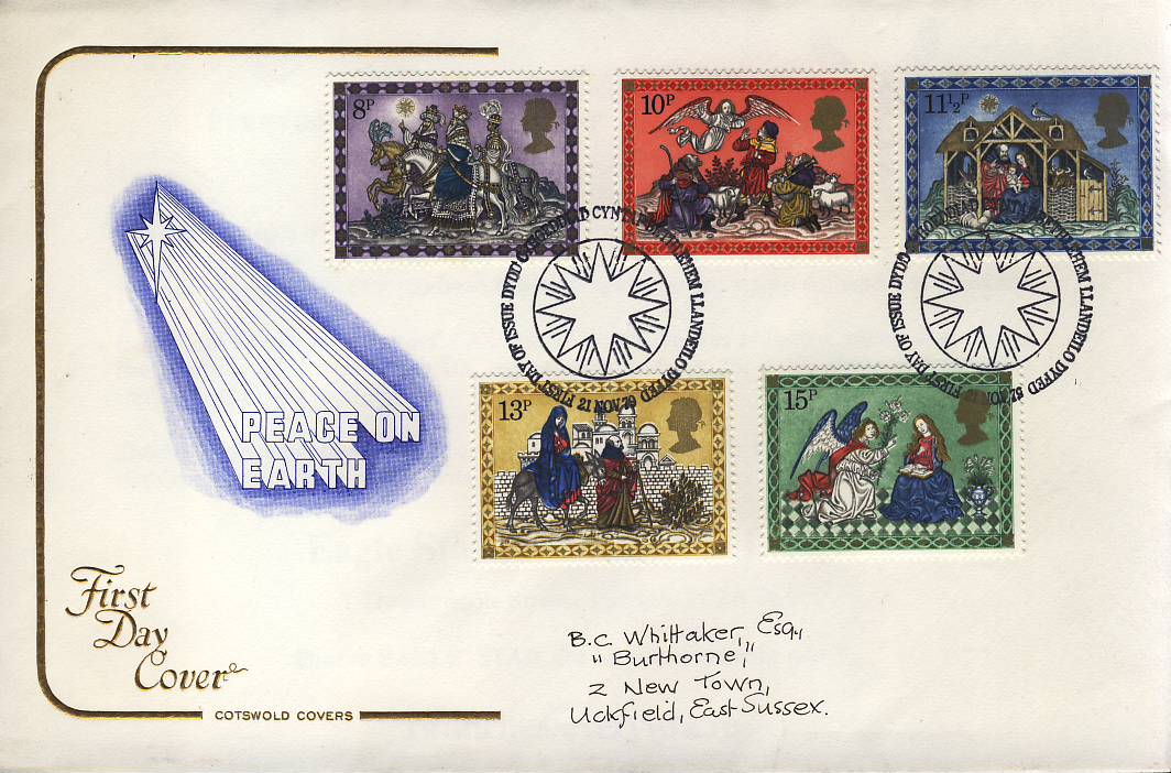 1979 PEACE ON EARTH Christmas Commemorative Stamps Cotswold Cover refG180 The Three Kings 8p – Angel appearing to the Shepherds 10p – The Nativity 11½p – Mary & Joseph travel to Bethlehem 13p and The Annunciation 15p stamps. VGC unsealed, with Bethlehem’s Star insert card.