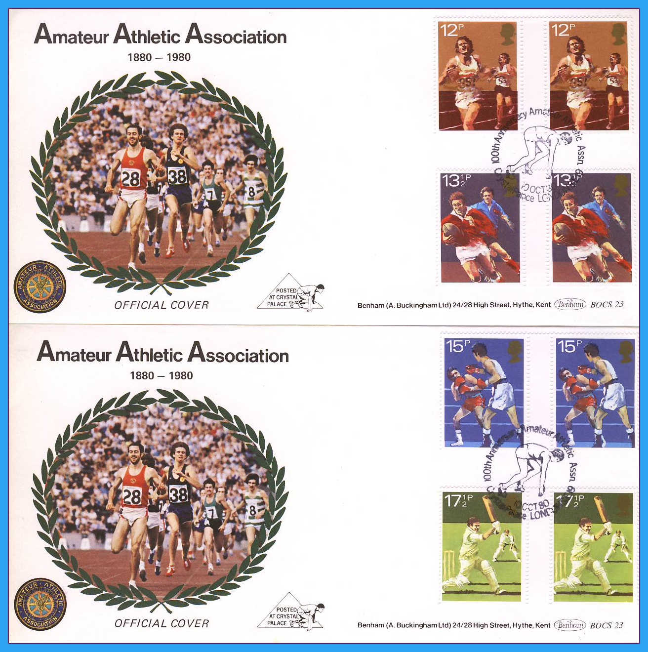2 x 1980-10-10 OFFICIAL Amateur Athletic Association covers Posted at Crystal Palace with Sports Anniversaries Gutter Pair Stamps Benham First Day Covers refc129