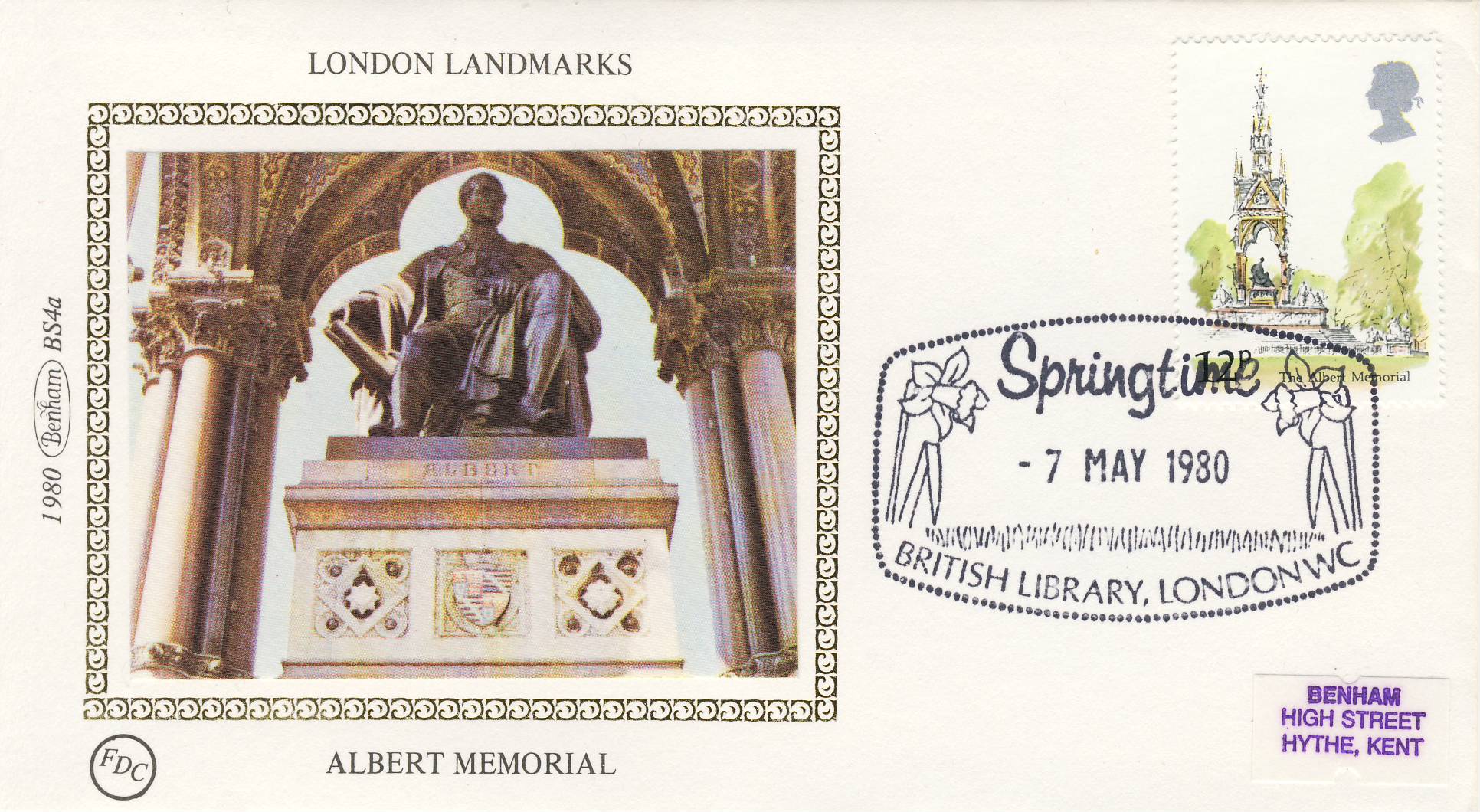 1980 BS4a London Landmarks Albert Memorial stamps Benham Sm Silk Cover refF521 Postmarked Springtime Daffodils British Library 7 May 1980. Very good condition. Unsealed with insert card. Ideal for gift, money envelope etc