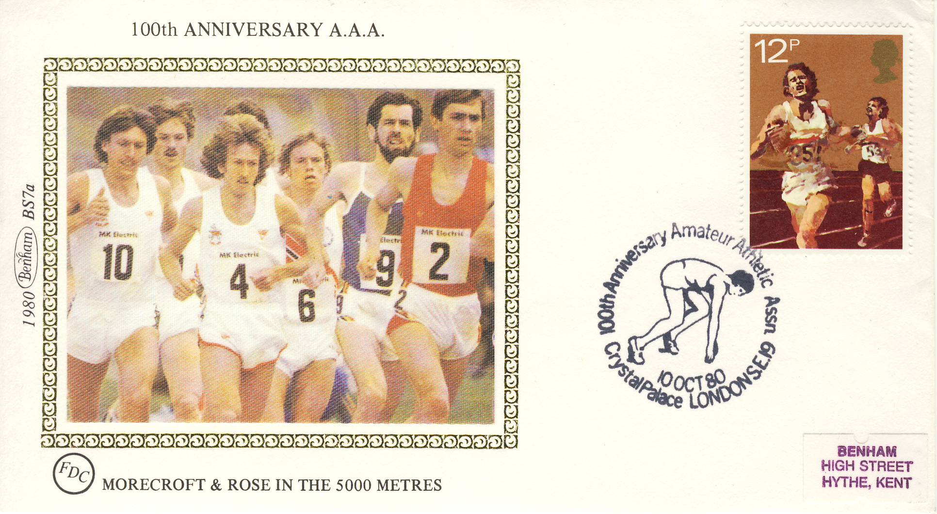 1980 BS7a ATHLETICS Morecroft & Rose SPORT stamps Benham Sm Silk Cover refF510100th Anniversary A.A.A. 5000 metres. Postmarked Crystal Palace London. Very good condition. Unsealed with insert card. Ideal for gift, money envelope etc
