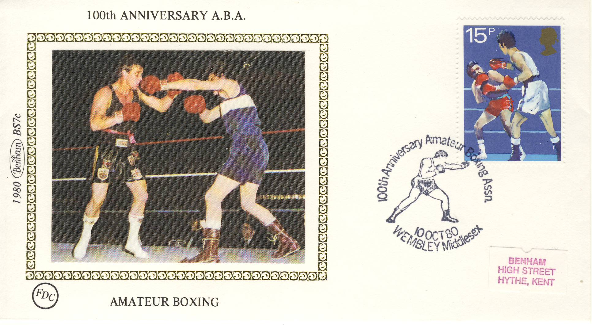 1980 BS7c Amateur Boxing SPORT stamps Benham Sm Silk Cover refF508Postmarked Wembley Middlesex. Very good condition. Unsealed with insert card. Ideal for gift, money envelope etc