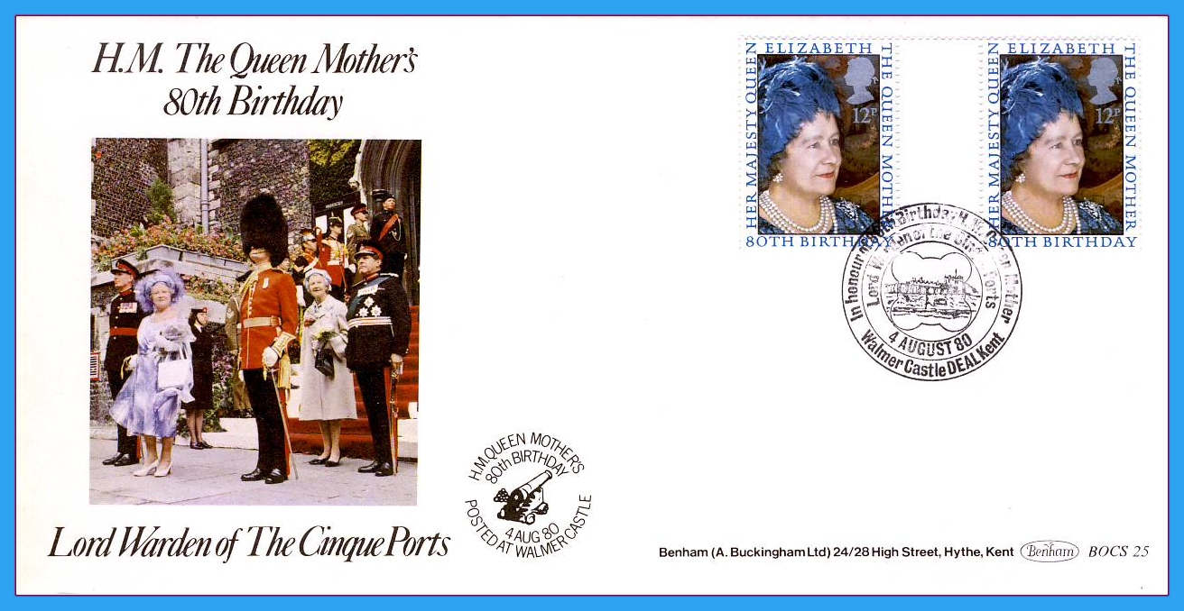 1980 Gutter Pair Queen Mother 80th Birthday Stamps First Day Cover. Lord Warden of The Cinque Ports. Posted at Walmer Castle BOCS25 BENHAM FDC rc155