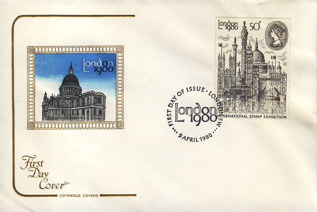 1980 LONDON 50p Stampex COTSWOLD Commemorative Stamp First Day Cover refG171 1980-04-09 London 50p 1980 Stampex Stamps FDC Good Condition unsealed, with insert card.
