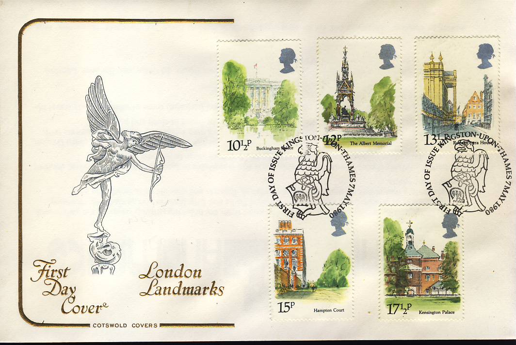1980 LONDON LANDMARKS Kingston on Thames Commemorative Stamps COTSWOLD Cover refG172 Buckingham Palace 10½p, The Albert Memorial 12p, Royal Opera House 13½p, Hampton Court 15p and Kensington Palace 17½p stamps. VGC unsealed, with insert card.
