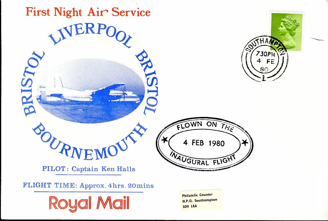 1980 Southampton date stamp Flown Royal Mail 1st Night Air Service BRISTOL LIVERPOOL BOURNEMOUTH refD200