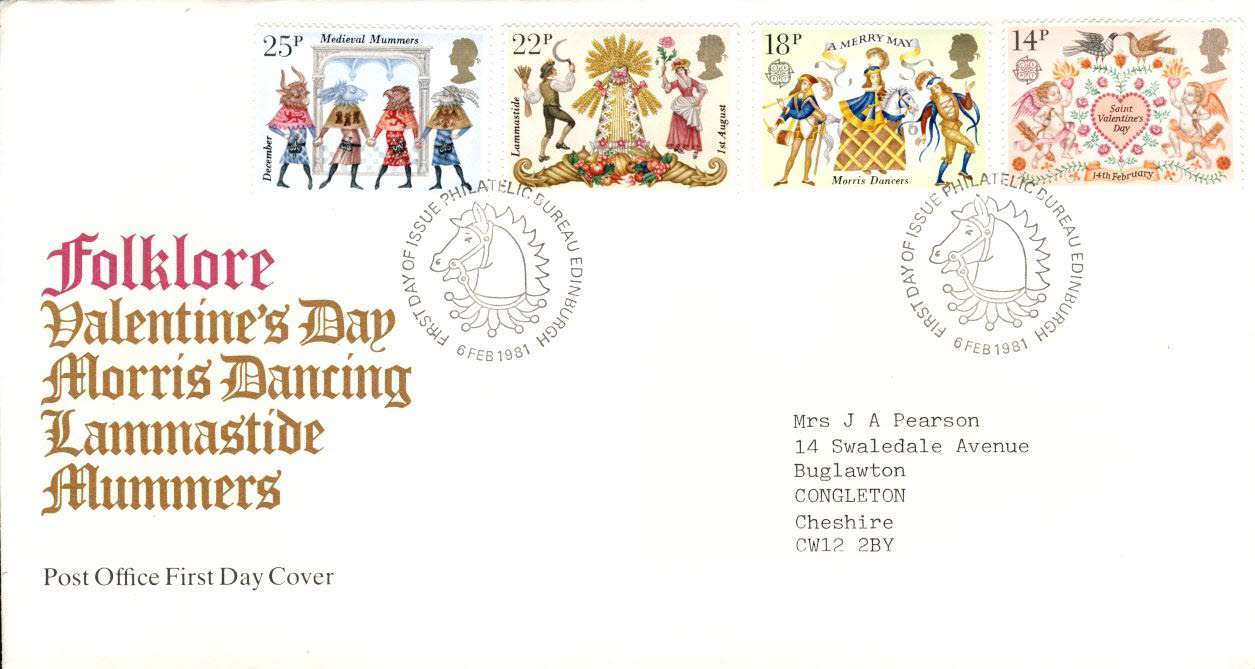 1981-02-06 Folklore Stamps FDC Morris Dancing Lammastide Mummers refE195 Cover in good condition. Please see larger photo and full description for details.