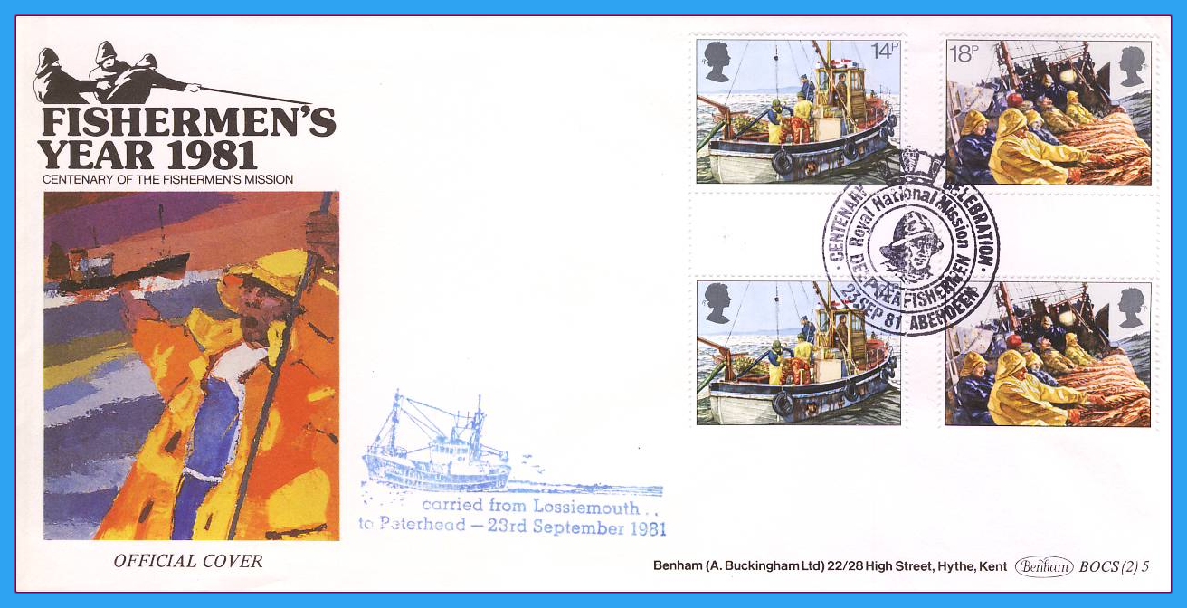 1981-09-23 Fishing Industry Stamps Fishermen’s Year OFFICIAL COVER Lossimouth Peterhead BOCS(2)5 rcd122 First Day Cover