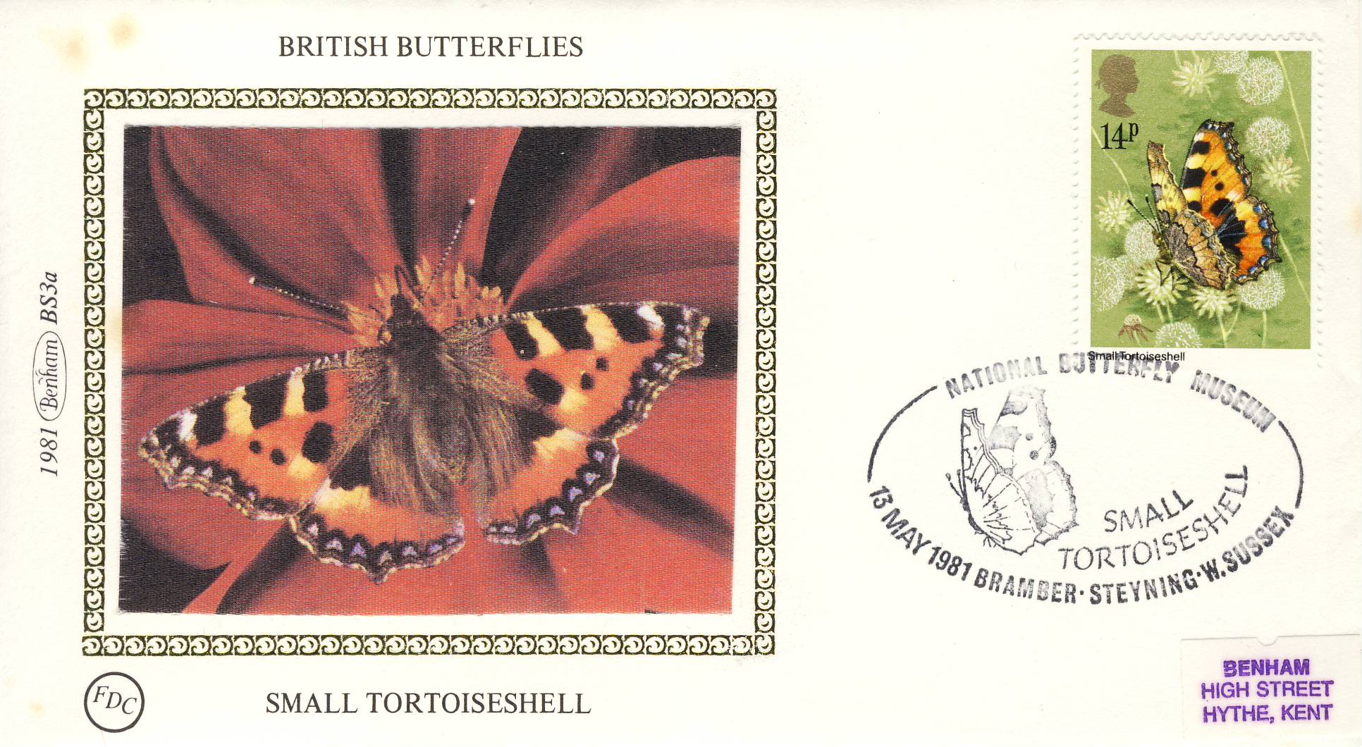 1981 SMALL TORTOISESHELL BS3a BRITISH BUTTERFLIES Benham Sm Silk Cover refF496Postmarked BRAMBER STEYNING W.SUSSEX. good condition. Unsealed with insert card. Ideal for gift, money envelope etc