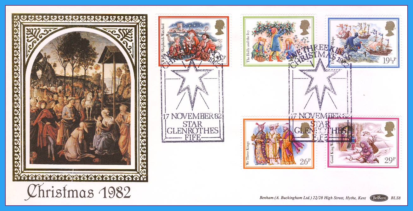 1982-11-17 Christmas Stamps Benham Silk FDC BLS8 FDC STAR GLENROTHES FIFE shs We Three Kings rcd102