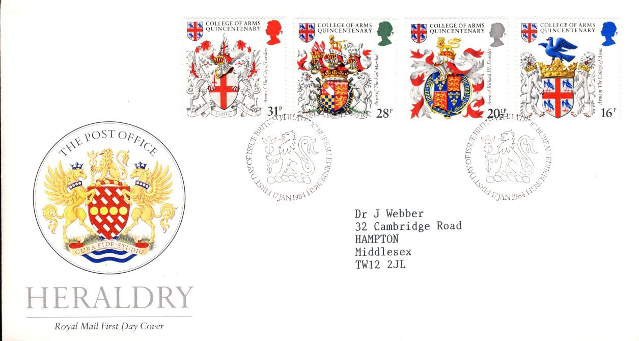 1984-01-17 Heraldry College of Arms Stamps FDC refE168 Cover in good condition. Please see larger photo and full description for details.