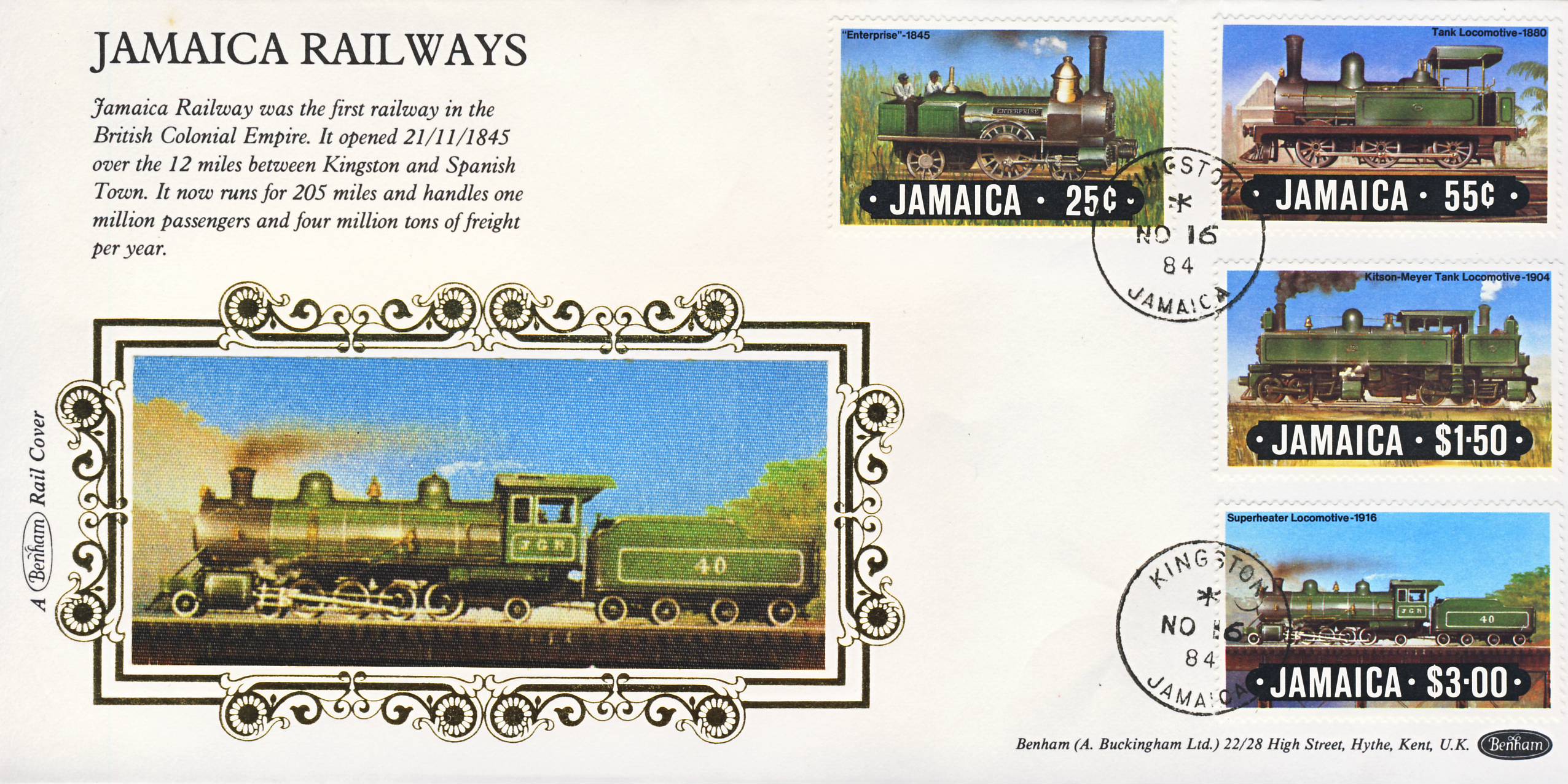1984 Benham Silk Rail Cover JAMAICA RAILWAYS Kingston no16 84 postmark – 4 locomotive stamps – No insert – ref46