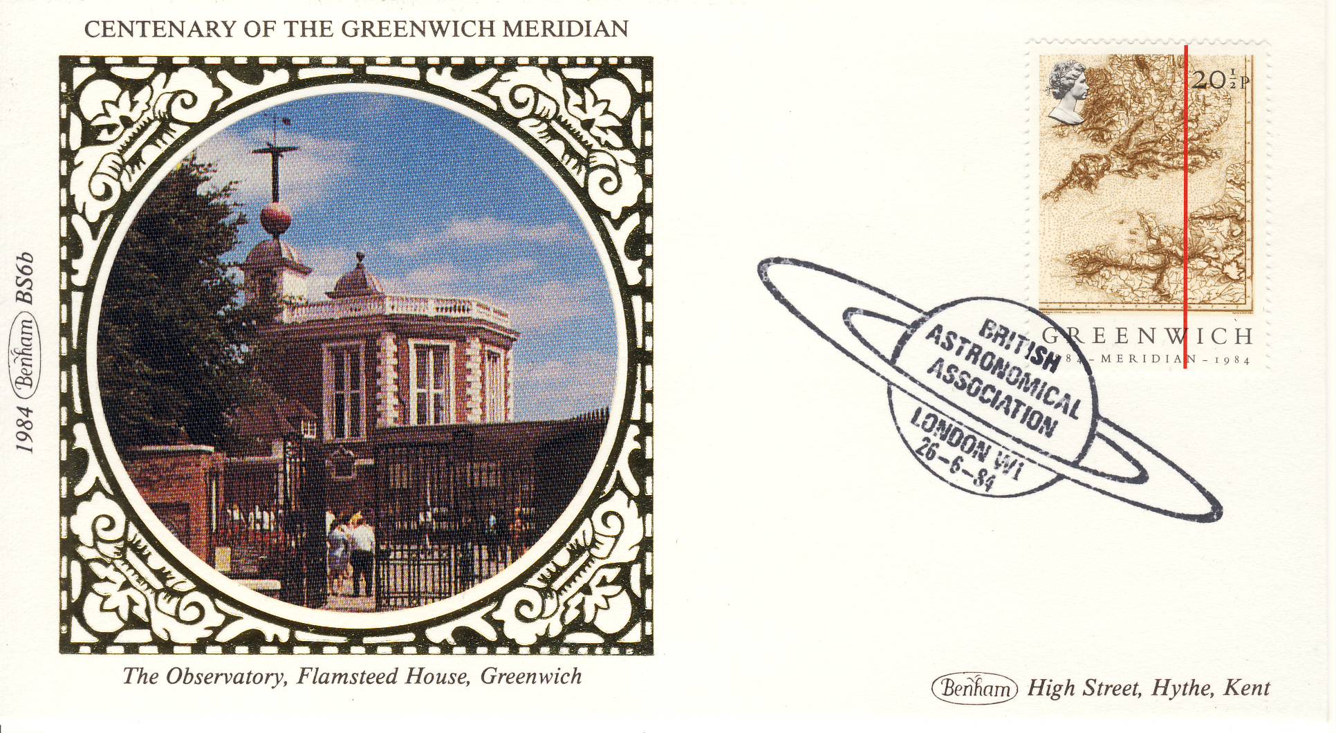 1984 BS6b Greenwich Meridian Benham Sm Silk Cover refF555 Postmarked British Astronomical Association London W1 26-6-84 Very good condition. Unsealed with insert card. Ideal for gift, money envelope etc