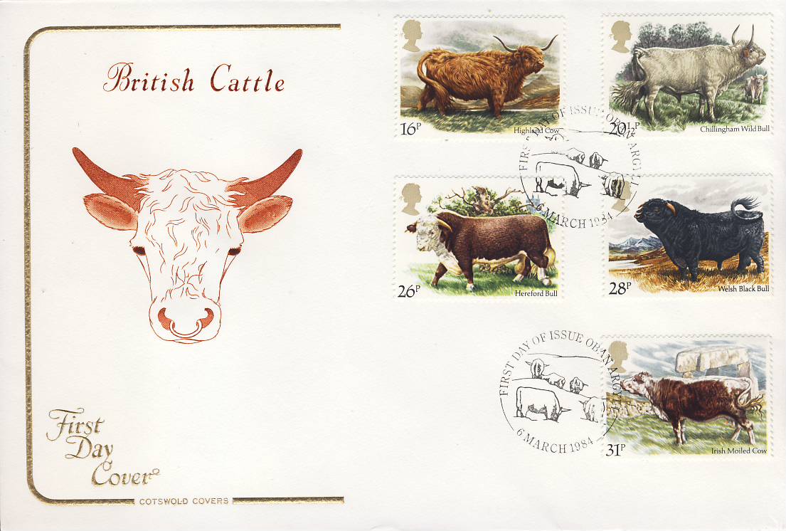 1984 OBAN ARGYLL British Cattle FDC Cotswold Cover refG154 VGC unsealed with insert card. Hereford Bull, Chillingham Wild Bull, Welsh Black Bull and Highland Cow.