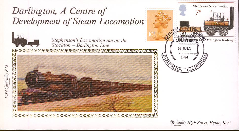1984 R12 Darlington Development of Steam Locomotion Benham Small Silk Cover with special handstamp and an insert card. refA373