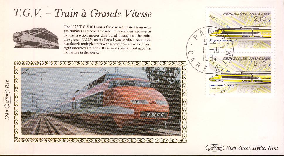 1984 R1 Benham Small Silk Railway Cover T.G.V. Train a Grande Vitesse. Paris Gare cds and shs Paris Lyon TGV on reverse side. No insert card. refA380