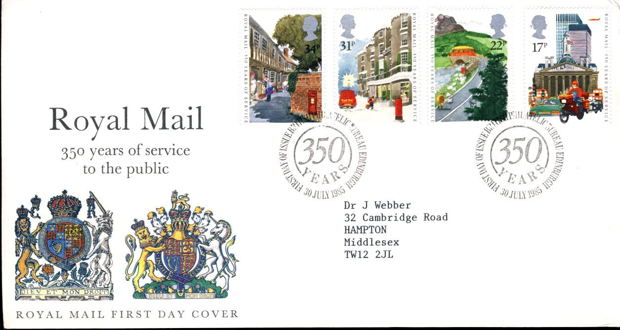 1985-07-30 350 Years of the Royal Mail Stamps FDC refE157 Cover in good condition. Please see larger photo and full description for details.