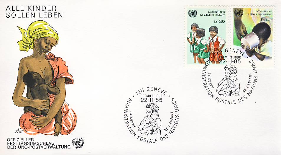 1985 Alle Kinder Sollen Leben Geneve UN United Nations stamp cover refF451